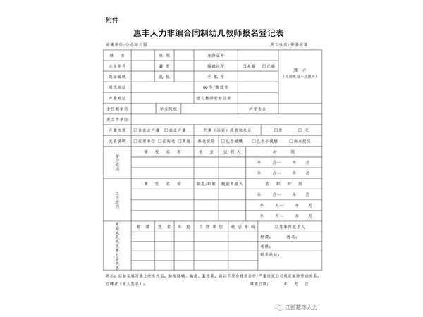 為滿足我市公辦幼兒園師資需求,我公司面向社會公開招聘一大批非事業編合同制幼兒教師,以勞務派遣的方式與用人單位進行勞動力資源開發(fā)合作。現將有關事項公告如下:一、招聘人數及崗位我市招聘非事業編合同制幼兒教師50名,具體崗位在選崗前公示。二、招聘方式通過第三方勞務公...